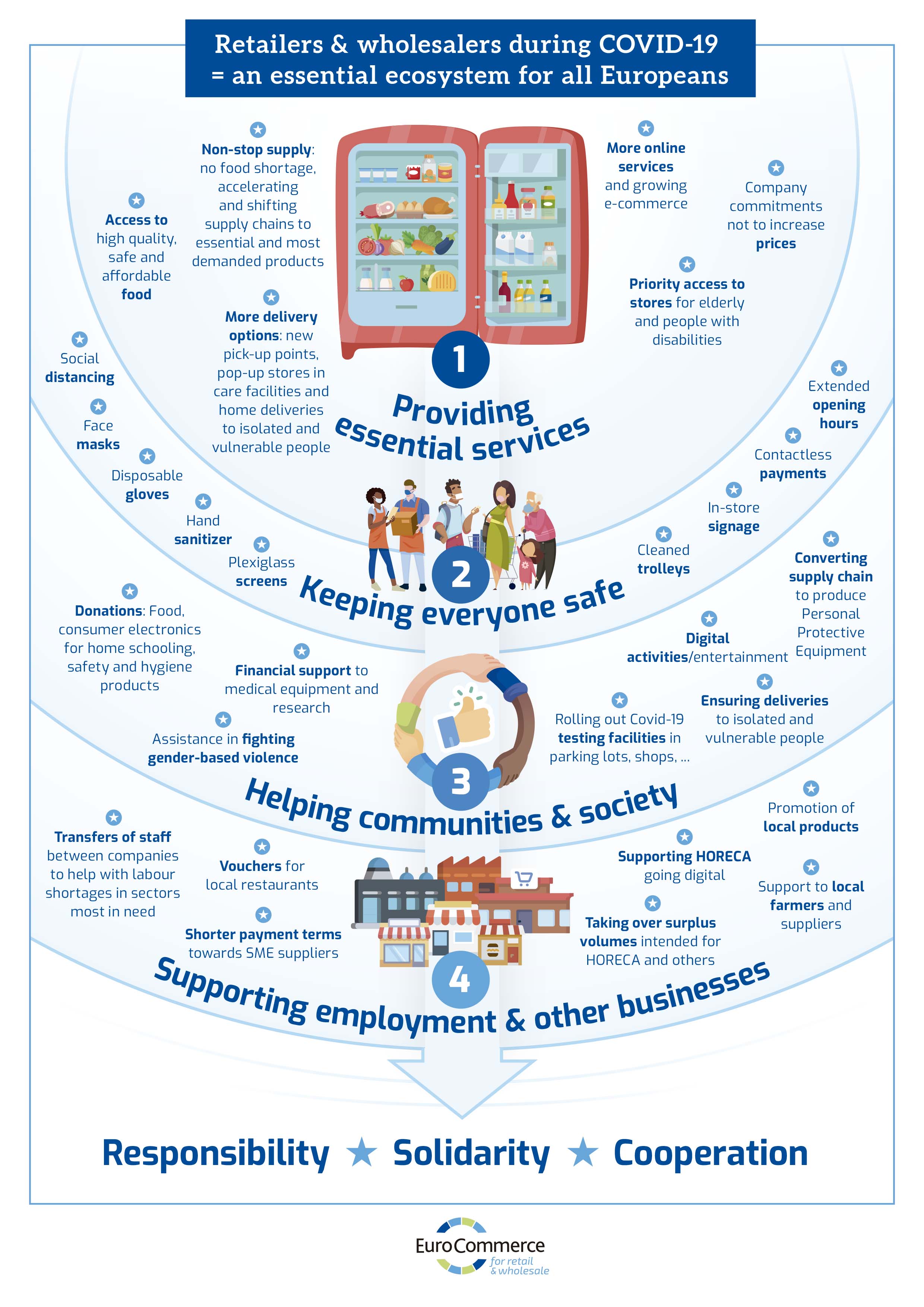 Eurocommerce recoge en esta infografía las cuatro razones por las que el comercio ha sido esencial para el bienestar de los europeos durante la crisis Covid-19 y como el trabajo de toda la cadena se ha llevado a cabo bajo premisas de responsabilidad, solidaridad y cooperación.