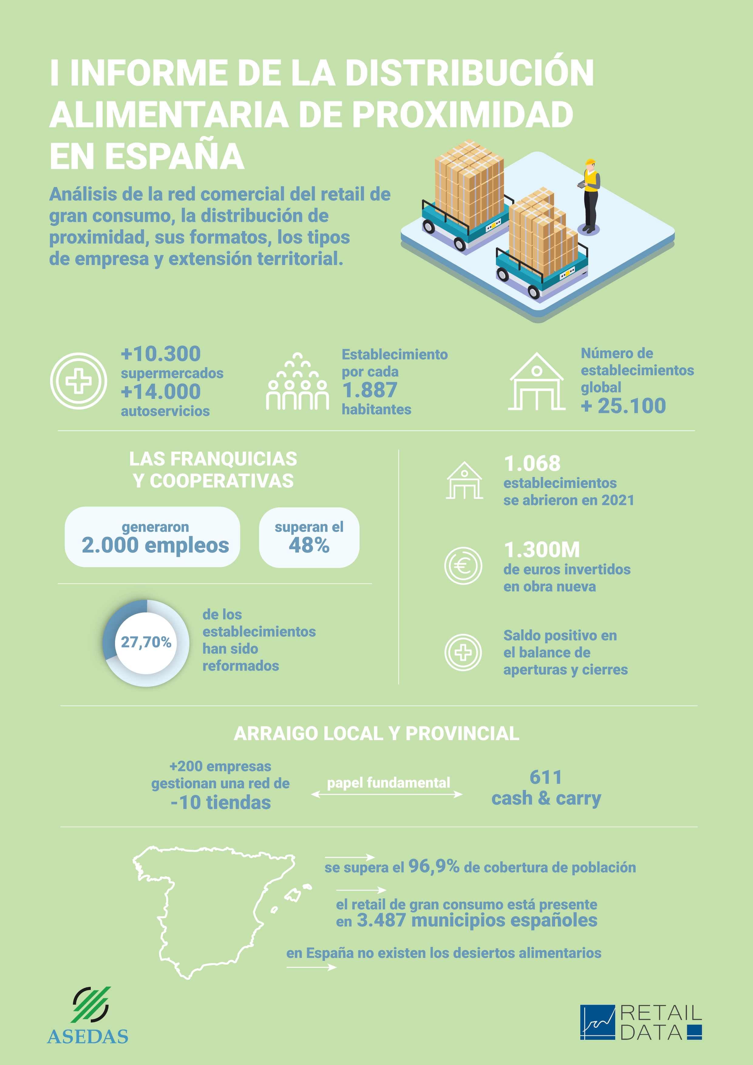 ASEDAS, Asociación Española de Distribuidores, Autoservicios y Supermercados, presenta el I Informe sobre Distribución Alimentaria de Proximidad en España. El texto, elaborado por la consultora Retail Data dirigida por Juan Carlos Matarrubia y Raquel Segura, recoge datos sobre la evolución de la red comercial del retail de gran consumo, con especial énfasis en el formato supermercado y autoservicio entre los años 2019 y 2021, el tipo de empresas que operan este tipo de establecimientos, el apoyo que presta la distribución mayorista y la cobertura territorial que alcanzan.