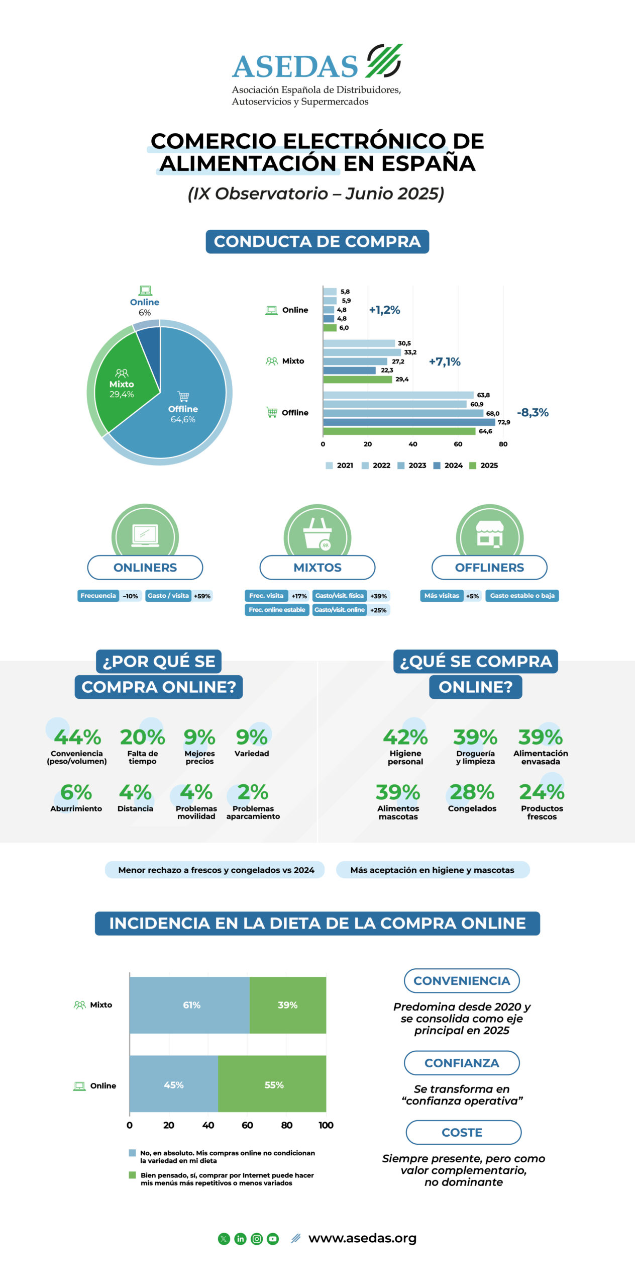 ASEDAS, representante del 75 por ciento de los supermercados y mayoristas de alimentación en España, presenta su IX Observatorio de Comercio Electrónico en Alimentación, elaborado por las Universidades Complutense y Autónoma de Madrid. A lo largo de los años, se constata la fortaleza de la red de distribución de alimentación de proximidad para llevar la alimentación muy cerca de los consumidores, con el desarrollo del comercio electrónico como un importante factor de conveniencia. Con este Observatorio, ASEDAS ofrece una herramienta rigurosa para comprender la importancia de los formatos de distribución de alimentación de proximidad en nuestra sociedad y la integración de la innovación y de la tecnología al servicio de las necesidades del consumidor.